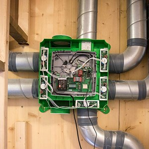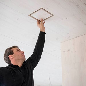 Het DucoTronic System bleek de missing link om in deze specifieke toepassing het binnenklimaat op esthetische wijze vanuit het oogpunt van de consument uitstekend onder controle te kunnen houden. Hiervoor werd de woning in twee bouwlagen ingedeeld waarbij zowel de toe- als afvoer per laag verschillend is. Von Meding legt uit: “Door een hoge aanwezigheidsgraad van de gezinsleden op de benedenverdieping kunnen de CO2-waarden vaak aanzienlijk oplopen. Daarom kozen we ervoor om de ventilatie elektronisch aan te sturen via de TronicTop 50 met zonale afzuiging door middel van de DucoBox Focus voor een optimaal gebruiksgemak. Op de eerste verdieping daarentegen werd een eenvoudiger systeem toegepast met standaard zelfregelende roosters en centrale afzuiging via de DucoBox Silent Connect; een toepassing die de luchtkwaliteit in deze situatie perfect beheersbaar weet te houden. Dat alle installatiecomponenten mooi in het ontwerp weg te werken zijn zoals de DucoVent Design AK met houten topping maakt het plaatje compleet.”