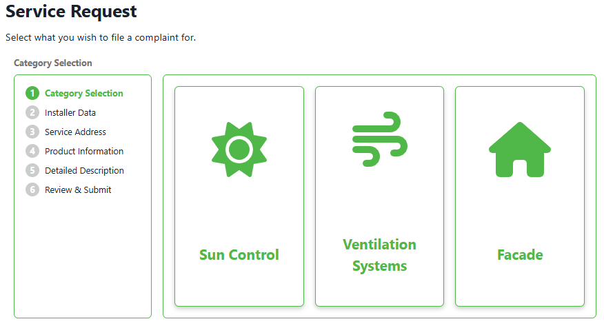 De service verzoeken kunnen voor alle producten uit Vero Duco; zonwering, façade en ventilatiesystemen. Van daaruit worden de klanten begeleid om een set aan vragen in te vullen die de noodzakelijke informatie bevatten voor de serviceafdeling.