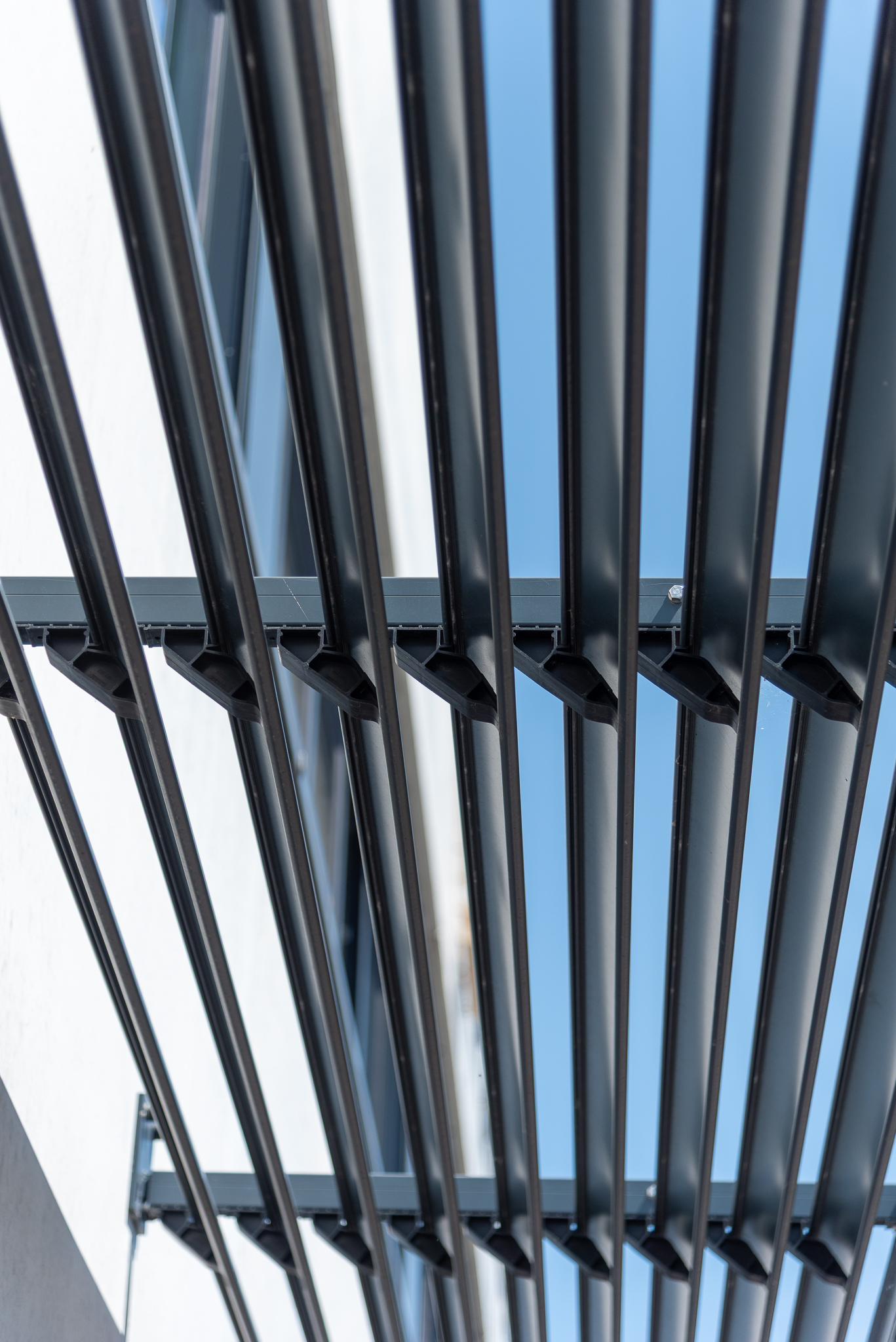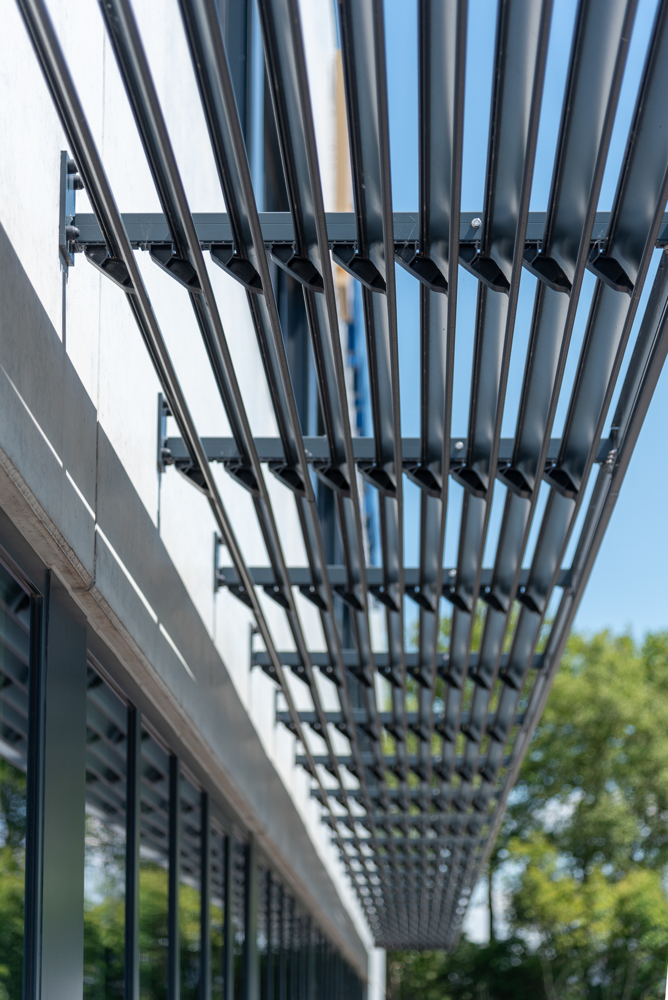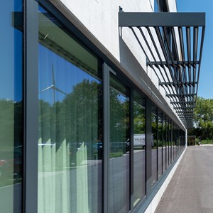 Voor hun kantoren op het gelijkvloers koos Maître André voor het DucoSun 100D Onderliggend zonweringsysteem. Dit permanente externe zonweringsysteem werd geplaatst als uitkragende luifel net boven de ramenpartij op de gevel.