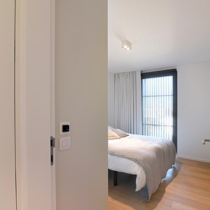 De ventilatieroosters werden onopvallend geïntegreerd op het raamprofiel, wat zorgt voor een strak design. ‘Bij deze residentie zijn ook heel wat niet werkende roosters ingezet omdat er eigenlijk niet zoveel roosters nodig waren om het nodige ventilatiewerk te doen. Op die manier werd, qua buiten- en binnenzicht, een esthetische eenheid binnen deze minimalistische structuur gevormd,’ verklapt Stevens.