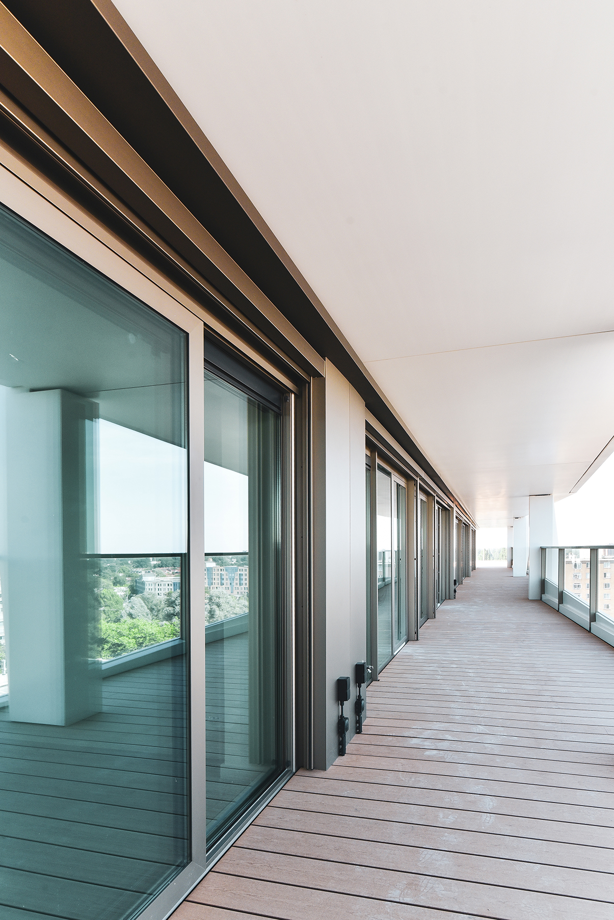 “De uitdaging bestond erin om het ventilatierooster discreet te integreren in de triple-beglazing van de schuiframen”, gaat van der Wal verder. “Voor woongebieden langs drukke invalswegen, waar geluidsoverlast een rol speelt, vormen geluiddempende ventilatieroosters de perfecte oplossing. Ze voorzien de ruimte continu van goed geventileerde lucht en dat zonder geluidsoverlast (demping tot 35dB). Voor Up Mountain bedachten we een custom-made oplossing met elektronisch gestuurde roosters. Het rooster werd voor dit project op het glas geplaatst, waardoor hij zich perfect leent voor schuiframen. De actief sluitende aluminium klep voorkomt bovendien fluittonen bij over- of onderdruk in hoogbouw. Met dit rooster ervaren de bewoners binnenshuis zowel een prettige, natuurlijke ventilatie als een aangename rust.”
