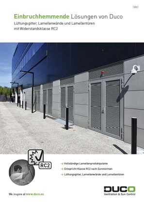 DUCO hat ein breites und innovatives Sortiment an Lamellenwandsystemen entwickelt: wasserabweisend, mit hoher Belüftungskapazität, schalldämmend ... Von nun an kann jede Art von Lamellenwand einbruchsicher* ausgeführt werden, indem sie mit der patentierten Lösung von DUCO ausgestattet wird. Dadurch erfüllt die Lamellenwand die Widerstandsklasse RC3 gemäß der europäischen Norm. Diese kompakte Lösung sorgt außerdem dafür, dass die Einbautiefe der RC3-Lamellenwand gleich bleibt im Vergleich zu den Standard-Lamellenwänden, was ein einheitliches Fassadenbild garantiert. Darüber hinaus lassen sich die Lamellenwände mit DucoDoor-Lamellentüren kombinieren, die ebenfalls einbruchsicher (RC2) ausgeführt werden können.
