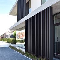 The shop window of the FortyFour retail space on the ground floor extends the full width of the façade, interrupted by the entrance for the flats above. Here, DucoSun Cubic vertical louvres were gratefully used to keep the entrance door somewhat out of sight. The combination of the concrete canopies and the vertical DucoSun louvres provide an ideal filter/transition to the flats, as well as a clean line of the whole.