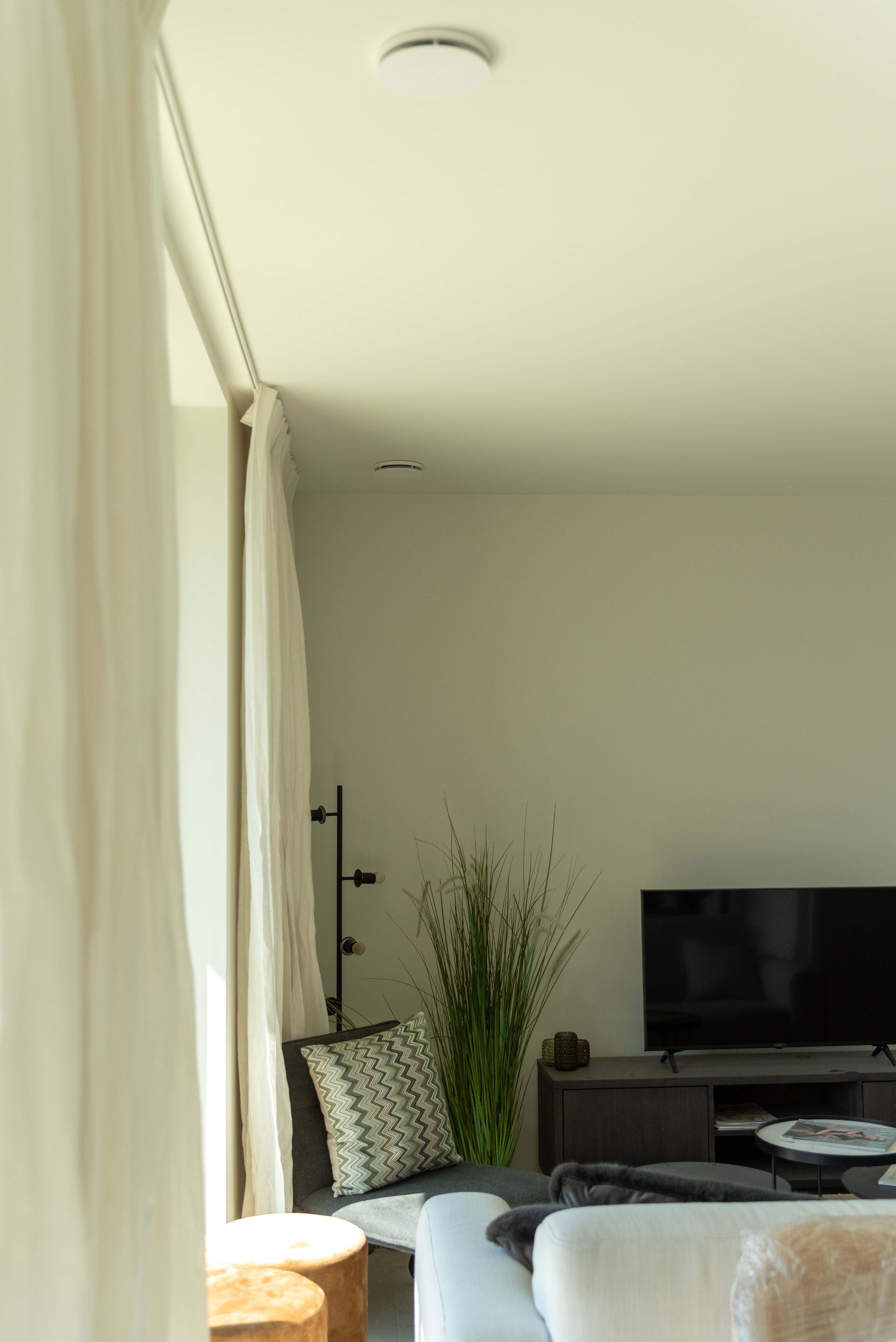 The system adapts automatically to the daily routine of the residents. In the morning it detects moisture in the bathroom and ventilates only there during showering. When residents leave the home, the system switches to a minimum operation of 10 %. Upon return, the system responds to cooking in the kitchen by ventilating only there, whilst in the evening the living room is ventilated based on CO₂ readings. In the bedrooms, the quiet system provides fresh air without disturbing night-time comfort.