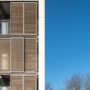 De architecturale zonwering DucoSlide gaat naadloos op in het moderne geheel en de houten lamellen geven het gevelbeeld een unieke toets. De onzichtbare bevestiging van de lamellen binnen het kader bieden een tweede esthetische meerwaarde. De houten accenten van de schuifpanelen komen in de groene omgeving volledig tot hun recht. Naast DucoSlide schuifpanelen werden ook lamellenroosters DucoGrille Solid M 30Z toegepast.