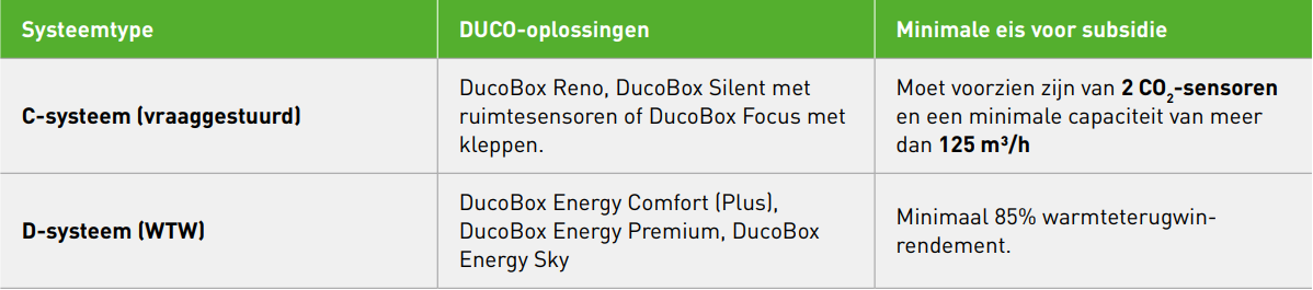 Deze eenmalige subsidie voorziet €400,- per woning dat beroep doet op energiezuinige ventilatiemaatregelen. De producten die in aanmerking komen zijn de volgende:
