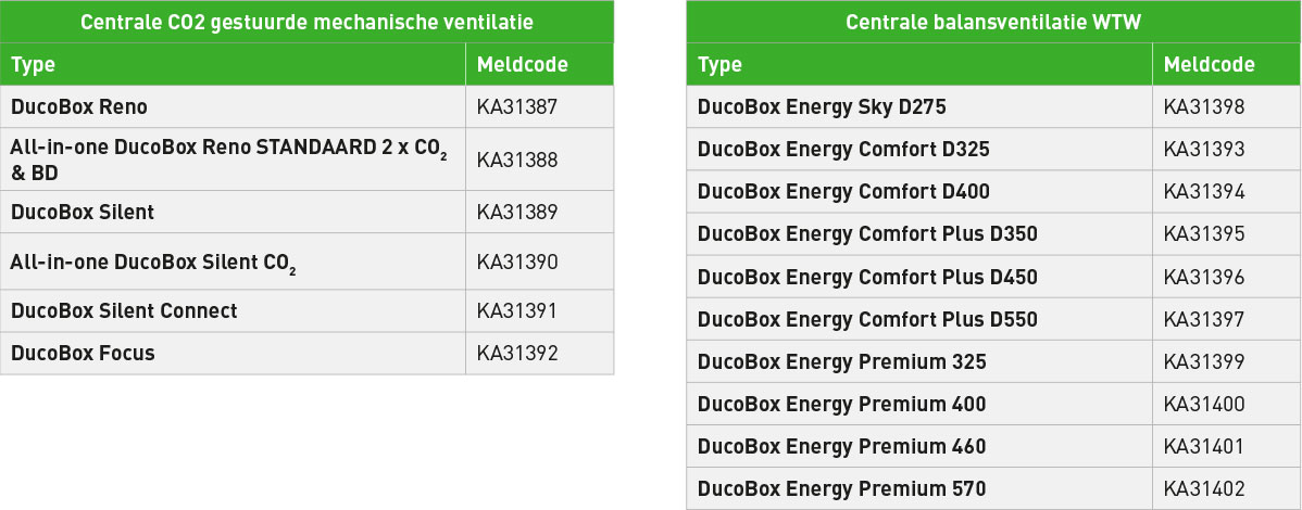 - Ga voor een subsidiabel DUCO-ventilatiesysteem en laat deze door een (erkend) installateur plaatsen. Voor de aanvraag is het belangrijk dat het systeem over een geldige meldcode beschikt.
